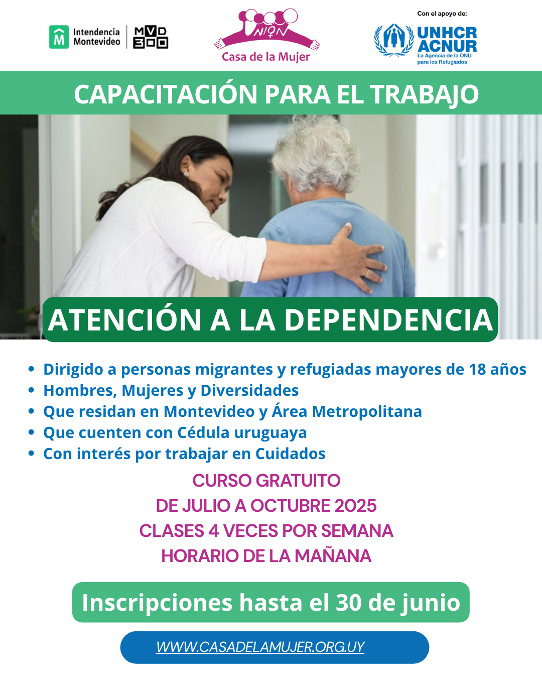 Casa de la Mujer de la Unión y la Intendencia de Montevideo a través de la Secretaria de Equidad Étnico Racial y para Poblaciones Migrantes (SEERPM), con el apoyo de la Agencia de la ONU para los Refugiados (ACNUR), anuncian el lanzamiento del curso «Atención a la Dependencia».
