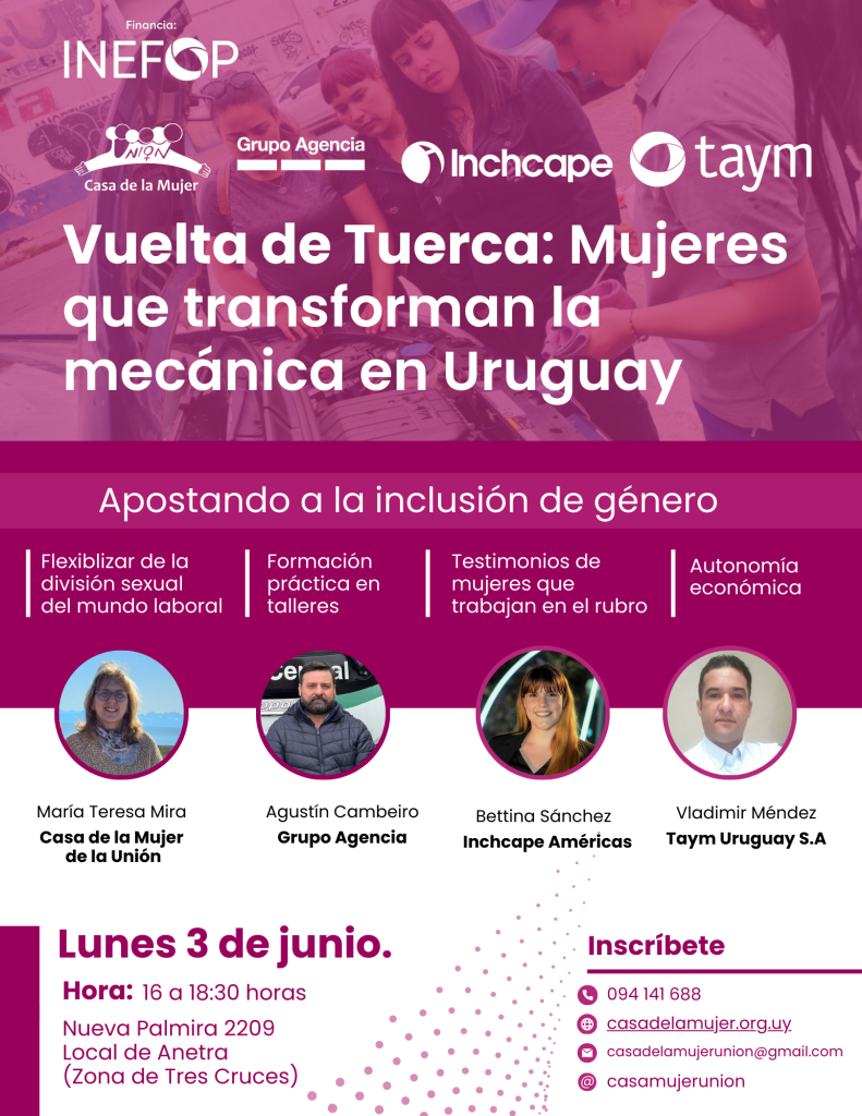 Las y los oradores serán María Teresa Mira, directora de Casa de la Mujer de la Unión, Agustín Cambeiro jefe de compra de taller Grupo Agencia, Bettina Sánchez del área de recursos humanos de Inchcape Américas y Vladimir Méndez, jefe de mantenimiento de Taym Uruguay S.A