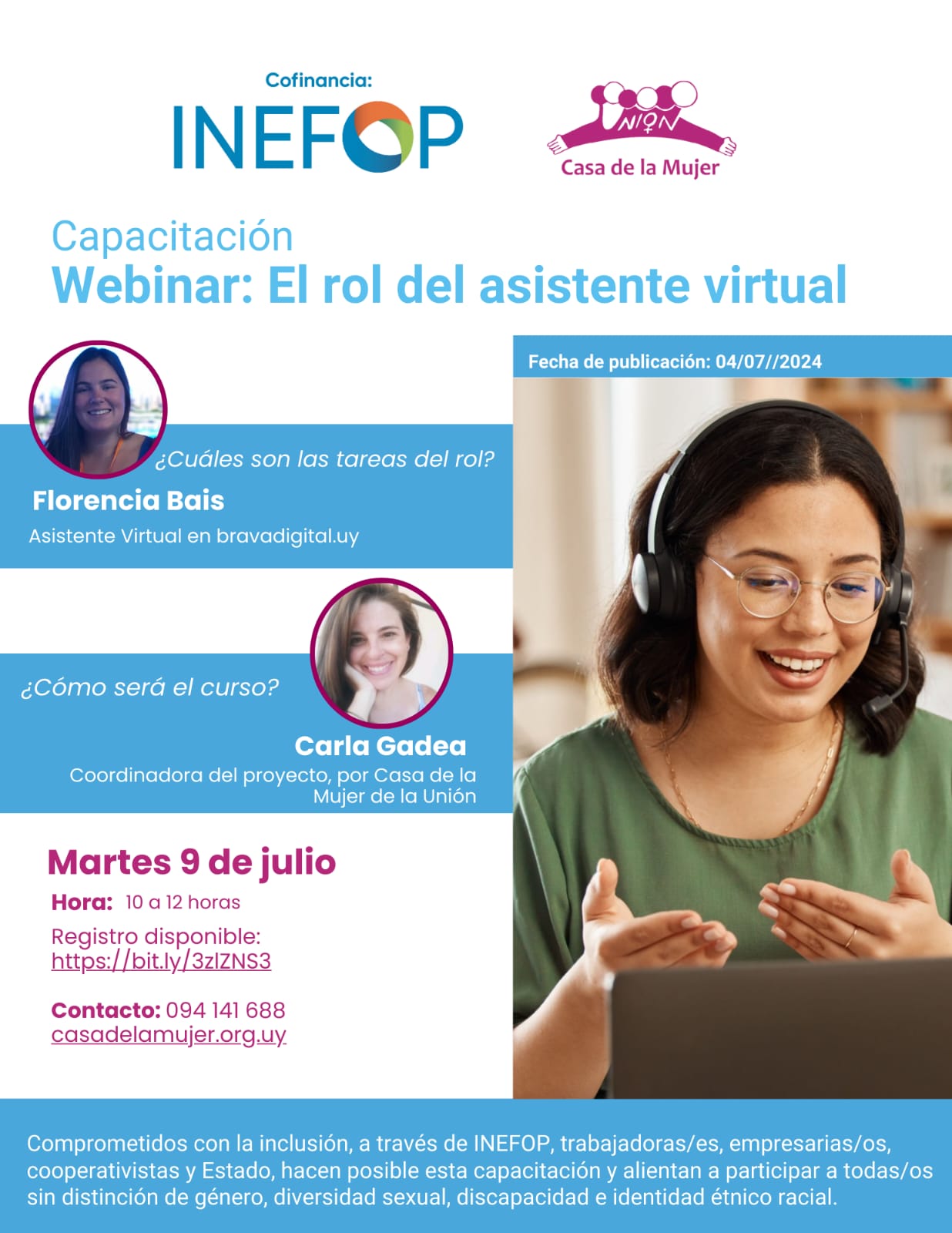 Como parte de la primera etapa de la primera etapa del Curso de Asistente Virtual, se realizará el Webinar: Cuál es el rol de asistente virtual. Vamos a contar los detalles del curso, así como las tareas que realizan las asistentes virtuales y su rol en distintos rubros.